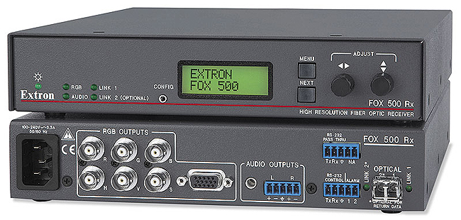Le récepteur fibre optique FOX 500 Rx d'Extron permet de transmettre sur de longues distances les signaux vidéo RVBHV, audio et RS-232 via une seule fibre. Fiable et extrêmement efficace sur des images haute résolution, il s'appuie sur la technologie entièrement numérique d'Extron pour transmettre pixel à pixel des images vidéo-informatiques d'une résolution allant jusqu'à UXGA 1600x1200. Conçu spécialement pour les systèmes audiovisuels, le FOX 500 Rx présente nombre de caractéristiques appréciées des intégrateurs telles que le réglage et le calibrage des images, le pilotage RS-232, deux sorties RVB et audio et le contrôle de l'installation en temps réel.