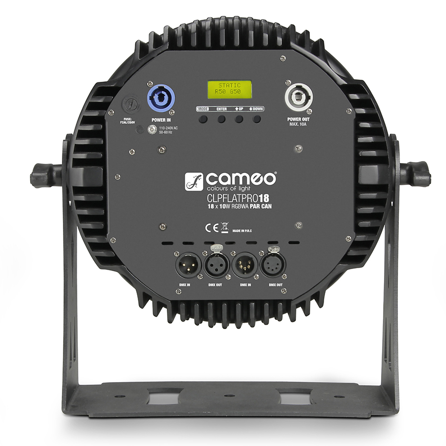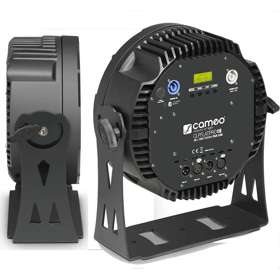 Son boîtier noir, en métal moulé, est équipé de connecteurs XLR 3 et 5 points pour les signaux DMX ; l'entrée/renvoi secteur s'effectuent sur connecteurs Neutrik PowerCon (branchements en cascade possibles). Le Cameo CLPFLATPRO18 est livré avec un support multifonction, offrant de nombreuses options de montage.