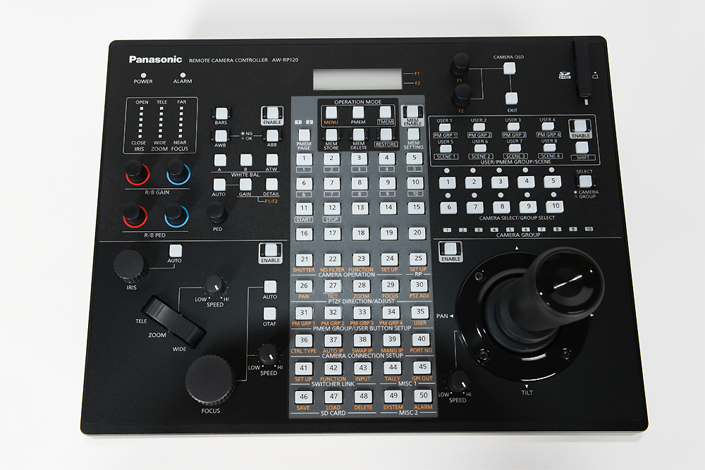 Le pupitre de commande AW-RP120 est compatible avec les caméras robotisées Panasonic. La connexion IP permet la mise en place de configurations importantes de façon simple et flexible pour contrôler jusqu'à 100 caméras.Le nouveau joystick permet un contrôle rapide et précis des déplacements de caméras, et un nouveau panneau de commandes propose des boutons d'ajustement colorimétriques. L'enregistrement de pré-réglages, une fonction de rappels multiples et l'enregistrement de déplacements de caméras permet de gagner du temps puisque tout peut-être effectué par une seule personne.