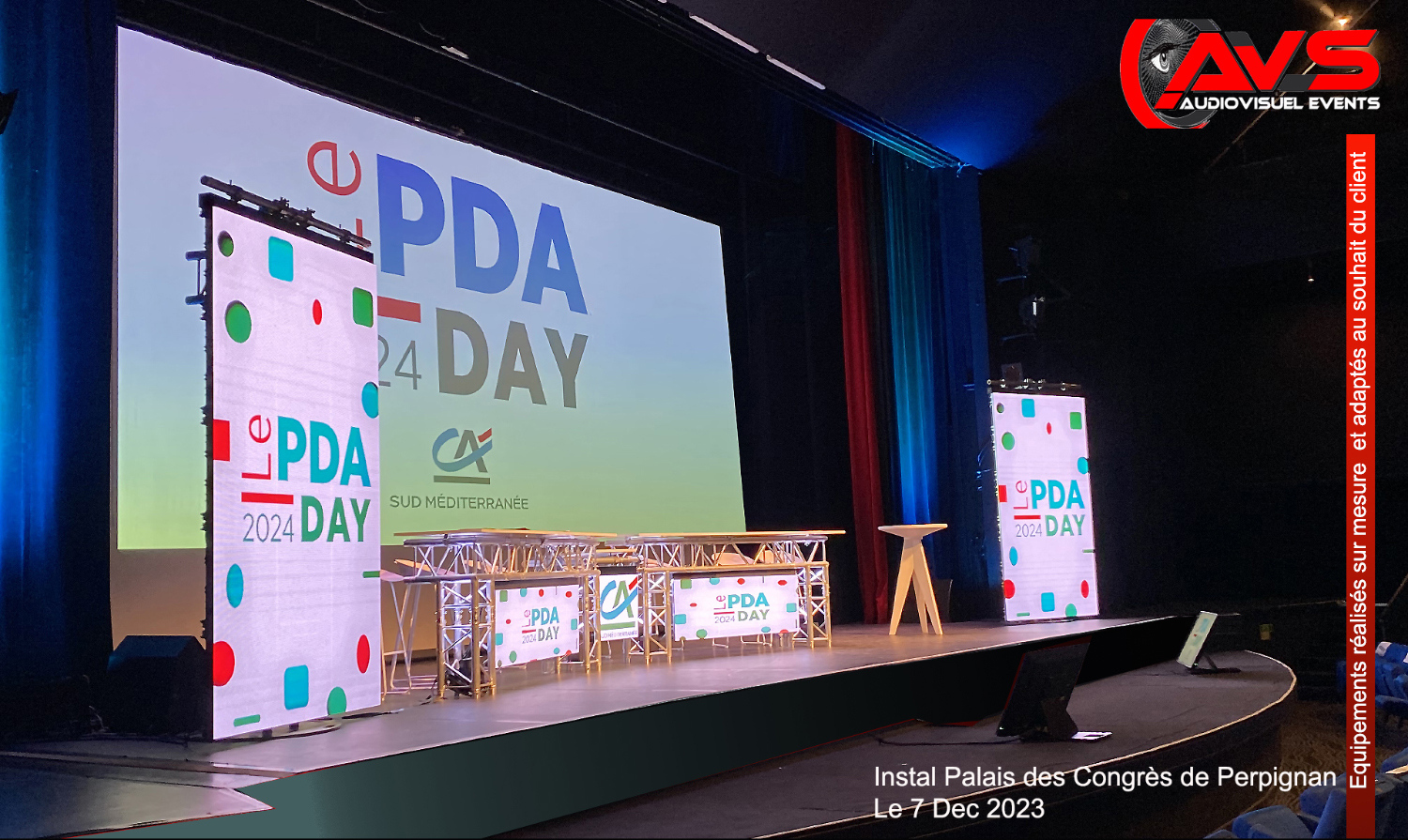 Ecran panoramique et Infodécor mapping vidéo, Palais des Congrès de Perpignan. Vidéoprojection grande puissance Christie Tri DLP Roadster 20K. Régie Folsom permettant le Multi-fenêtrage dynamique avec Background vidéo. Encore une réalisation live d' AVSaudiovisuel Events.